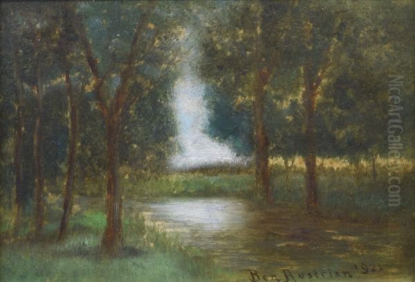 Ben Austrian’s Landscape - Trees by a Stream is a serene pastoral scene that captures the tranquil beauty of nature with delicate brushwork and a harmonious palette. Painted in the late 19th or early 20th century, Austrian’s work reflects the influence of the Barbizon School and Tonalism, emphasizing subtle gradations of color and atmospheric effects. The composition features slender trees lining a gently flowing stream, their reflections shimmering softly on the water’s surface. Austrian, lesser-known compared to his contemporaries, contributed to the American landscape tradition by blending realism with lyrical sensibility. Though not as widely recognized as the Hudson River School artists, his works possess an understated elegance that resonates with nature’s quiet poetry. This painting exemplifies his ability to evoke mood through restrained tones and careful composition, making it a meaningful piece for admirers of introspective landscapes.