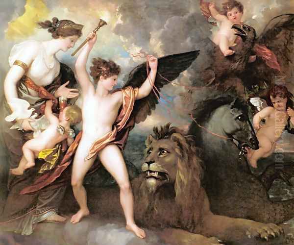 Benjamin West's Omnia Vincit Amor (The Power of Love in the Three Elements) is a masterful allegorical painting that exudes both grandeur and sensuality, capturing Cupid’s triumph over the forces of nature—earth, water, and air. Created in 1809, the work reflects West’s neoclassical style, blending idealized figures with dynamic composition, while his soft yet luminous palette nods to Romanticism’s emotive depth. As an American artist who became President of Britain’s Royal Academy, West bridged European traditions with New World perspectives, making this piece historically significant—it embodies Enlightenment ideals of love’s universal power yet anticipates the dramatic expressiveness of later 19th-century art. The painting’s intricate symbolism and theatrical staging place it among West’s most celebrated mythological works, offering a timeless meditation on love’s dominance.