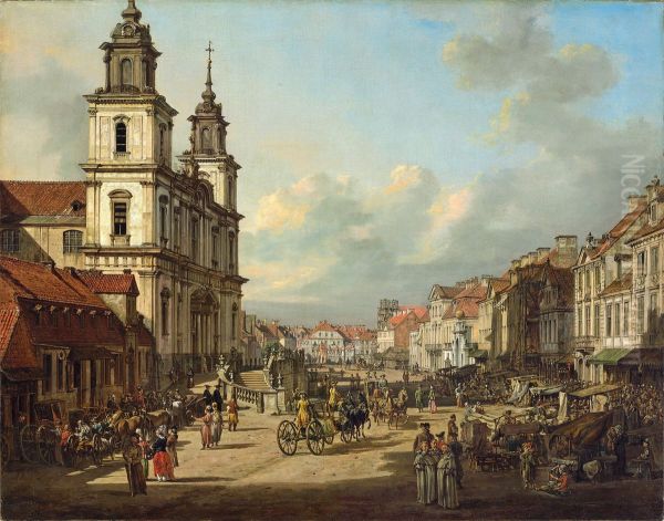 Bernardo Bellotto's Church of the Holy Cross in Warsaw is a masterful example of 18th-century veduta painting, capturing the grandeur of Warsaw’s urban landscape with meticulous precision. The painting depicts the ornate Baroque facade of the church bathed in soft, diffused light, while figures in period attire animate the bustling square, lending vitality to the scene. Bellotto, Canaletto’s nephew and protégé, was renowned for his topographical accuracy and atmospheric depth, blending documentary detail with poetic realism. This work exemplifies his role as a court painter to Poland’s King Stanisław August Poniatowski, offering both historical record and artistic flourish. Today, the painting stands as a cultural treasure, preserving Warsaw’s pre-war architecture and cementing Bellotto’s legacy as a bridge between Italian veduta traditions and Central European patronage.