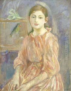 Berthe Morisot’s The Artist’s Daughter with a Parakeet (c. 1890) captures an intimate, fleeting moment between a child and her pet, suffused with the delicate luminosity of Impressionism. The painting portrays Julie Morisot, the artist’s young daughter, gently holding a green parakeet, her wide-eyed curiosity mirrored by the bird’s alert posture. Morisot’s loose, expressive brushwork and soft pastel palette—whispered pinks, creamy whites, and muted greens—create a tender, almost dreamlike atmosphere. As one of the few female Impressionists, Morisot challenged gender norms of her time, and this work exemplifies her mastery of domestic scenes, blending spontaneity with emotional depth. Though less famed than her peers like Monet or Renoir, her contributions to Impressionism are pivotal, offering a uniquely feminine perspective on modernity and familial bonds.