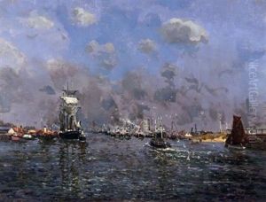 River Scene In Winter With Various Boats And Shipping To Foreground And Church And Town To Background