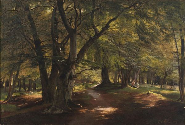Step into the serene woodland world of Parti fra Dyrehaven by Danish artist Carl Frederik Aagaard (1833–1895), a luminous example of 19th-century Golden Age realism. Bathed in dappled sunlight, the painting captures a tranquil forest scene in Denmark’s renowned Jægersborg Dyrehaven deer park, where slender beech trees stretch skyward and sunlight filters through leaves in delicate brushstrokes. Aagaard, a pupil of P.C. Skovgaard, mastered the art of plein air intimacy, blending meticulous botanical detail with an almost Impressionistic play of light—evident in the way shadows dance across the forest floor. Though less internationally prominent than his contemporary Hammershøi, Aagaard’s works epitomize Denmark’s cherished tradition of nature painting, celebrating local landscapes with poetic precision. This piece, likely created between 1860–1890, reflects the era’s Romantic reverence for nature while foreshadowing the looser strokes of Nordic Symbolism.