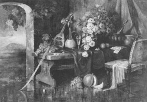A Still Life With Yellow Roses, Fruits, Kettle, Glass, Bottles And A Pearl Necklace On A Table