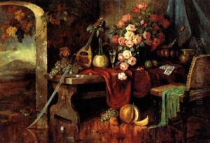 Paladsinterior Med Buket Af Lyserode Roser, Frugter, Chiantiflaske, Mandolin Samt Spillekort Pa Et Bord