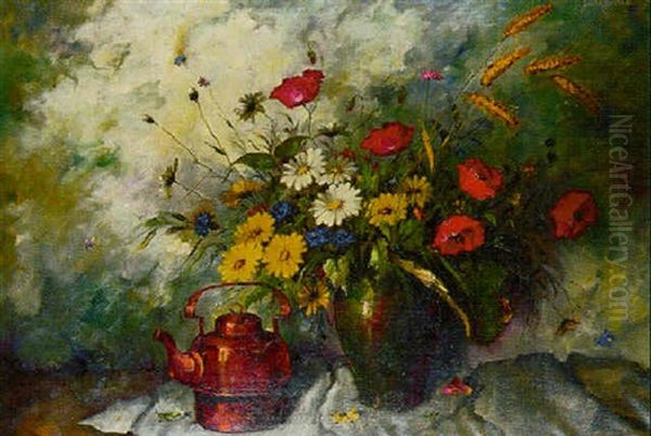 Summer Flowers In A Vase By A Copper Kettle