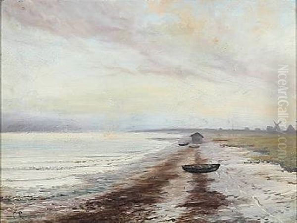 Carl Locher’s Stranden Ved Raabjerg (The Beach at Raabjerg) captures the raw, windswept beauty of Denmark’s northwestern coastline with striking realism. Painted in the late 19th century, the work embodies the Skagen artistic movement’s fascination with natural light and rural life, showcasing Locher’s mastery in portraying shifting skies, textured dunes, and the restless North Sea. The muted yet luminous palette—soft grays, ochres, and marine blues—evokes a sense of tranquil solitude, while the dynamic brushwork infuses the scene with movement, as if the sea breeze could ripple through the canvas. As a key figure of the Skagen Painters, Locher’s contributions bridged Danish realism and French plein-air techniques, making this piece a testament to Northern Europe’s artistic dialogue during the era. Its historical significance lies in its authentic depiction of Jutland’s landscapes, a theme central to national romanticism.
