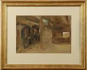 Carl Wilhelm Wilhelmson's Hast I Stall (1896) is a strikingly intimate portrayal of rural life that showcases Swedish National Romanticism’s poetic realism. The painting depicts a moment suffused with quiet labor—horses resting in a stable, bathed in soft, diffused light that filters through wooden beams, casting warm amber shadows across textured walls and hay-strewn floors. Wilhelmson’s masterful brushwork blends earthy tones (ochres, umbers) with muted blues, creating a harmonious yet tangible atmosphere. Deeply influenced by his academic training in Gothenburg and Paris, the artist bridges genre painting’s narrative charm with plein air techniques, elevating everyday scenes into timeless meditations. Hast I Stall holds historical significance as part of Sweden’s cultural shift toward celebrating agrarian heritage during industrialization. Its delicate balance of detail and mood—reminiscent of Jules Bastien-Lepage’s rural works—solidifies Wilhelmson’s legacy as a pivotal figure in Nordic art.