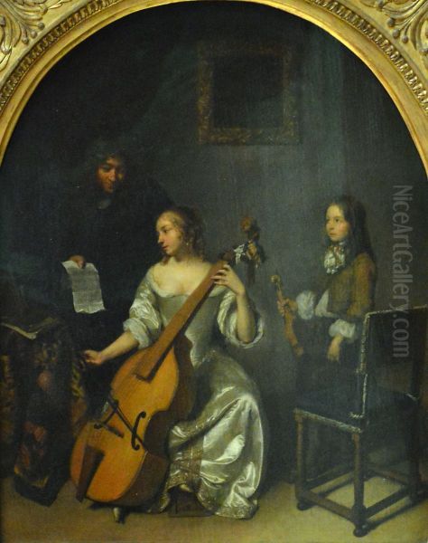 Caspar Netscher’s The Music Lesson on the Viola da Gamba (c. 1666) is a captivating example of Dutch Golden Age genre painting, exuding an air of refined intimacy. The scene depicts an elegant domestic moment—a young woman receiving instruction on the viola da gamba, her delicate posture and focused expression radiating quiet concentration. The warm, diffused light bathes the figures, highlighting the rich textures of satin gowns and wood-grained instruments, while the soft shadows deepen the sense of depth and realism. Netscher, a pupil of Gerard ter Borch, was renowned for his meticulous detail and refined portrayal of upper-class leisure, embedding subtle narratives of cultural sophistication. This work epitomizes the 17th-century Dutch fascination with music as a symbol of harmony and education, while its polished execution showcases Netscher’s mastery in rendering fabrics and complexions. Though less widely celebrated than Vermeer or Metsu, Netscher’s oeuvre holds a distinct place for bridging intimate genre scenes with aristocratic elegance.