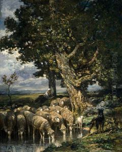 In Sheep Grazing Beneath An Old Tree, Charles Emile Jacque, a key figure of the Barbizon School, masterfully captures the serene harmony of rural life in mid-19th century France. The painting depicts a tranquil pastoral scene: a weathered tree arches protectively over a flock of grazing sheep, their woolly forms rendered with soft, textured brushstrokes that evoke warmth and vitality. The subdued earthy palette—olive greens, muted browns, and soft grays—imbues the scene with a timeless, almost poetic quality, reflecting the Barbizon School’s dedication to realism and their reverence for nature. Jacque’s intimate knowledge of rural subjects, honed through years of observing farm life, lends the work an authenticity that resonates deeply. As a contemporary of Millet and Rousseau, Jacque played a pivotal role in shifting art’s focus from idealized landscapes to raw, unfiltered rurality, making this piece not just a visual delight but also a significant artifact in the evolution of 19th-century European art.