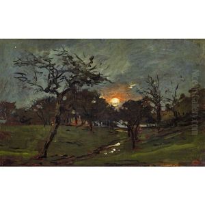 The enchanting Landschaft Bei Untergehender Sonne (Landscape with Setting Sun) by Charles-François Daubigny captures nature’s quiet grandeur in the golden glow of twilight. Painted in the mid-19th century, this luminous work embodies the Barbizon School’s devotion to plein-air realism while hinting at the poetic Impressionism to come. Daubigny’s brushwork breathes life into the scene — a tranquil river mirrors streaks of apricot and lavender as the sun dips below trees, their silhouettes softened by atmospheric perspective. As a bridge between traditional landscape painting and modernism, Daubigny influenced Monet and Van Gogh with his loose, expressive strokes and intimate communion with nature. The composition balances earth and sky in a harmonious dialogue, making it a seminal work in the transition toward capturing light’s ephemeral beauty.