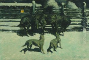 Charles Marion Russell’s The War Party (1903) is a dynamic masterpiece that captures the raw intensity and romanticism of the American West. The painting depicts a group of Native American warriors on horseback, their figures taut with energy as they ride across the plains. Russell’s brushwork is vigorous and fluid, imbuing the scene with a sense of motion and urgency, while the earthy palette of ochres, deep blues, and muted greens evokes the untamed landscape. As a former cowboy, Russell brought firsthand authenticity to his depictions of frontier life, blending realism with a mythic grandeur. This work exemplifies his role as a key figure in Western art, alongside Frederic Remington, offering a counterpoint to romanticized Eastern narratives by portraying Indigenous perspectives with dignity. The War Party remains significant for its unvarnished portrayal of Western themes during a period of rapid modernization.