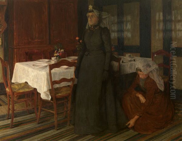 The Bridal Dress by Charles Mertens is a breathtaking example of late 19th-century academic painting, radiating elegance and delicate beauty. Depicting a young bride adjusting her exquisite lace gown in front of a mirror, the painting captures a moment of quiet anticipation and feminine grace. Dating to 1899, this Belgian masterpiece exemplifies Mertens's refined technique and the influence of French academic traditions on Belgian art. The luxurious fabrics shimmer with tactile realism, while careful attention to lighting creates an atmosphere both intimate and transcendent. Currently housed in the Royal Museum of Fine Arts Antwerp, this work showcases Mertens's mastery of bridal portraiture and remains significant for its contribution to Belle Époque bridal iconography. Beyond technical brilliance, the painting endures as a poetic meditation on matrimonial traditions and feminine identity during Europe's Gilded Age.