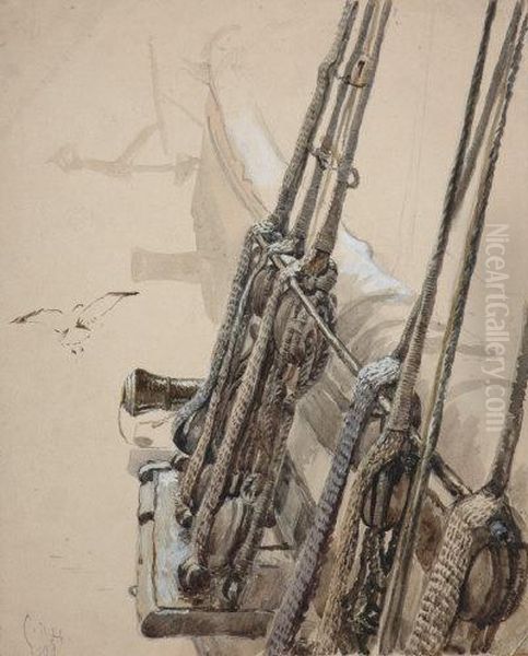 Charles Napier Hemy's The Shrouds "from 10-gun Brig" is a striking maritime masterpiece that captures the raw power and drama of the sea. Painted in 1881, this work exemplifies Hemy's signature precision in depicting nautical scenes, where every rope, wave, and cloud is rendered with meticulous realism. The composition centers on the rigging of a 10-gun brig, its shrouds taut against a turbulent sky, evoking a sense of tension and movement. Hemy, a leading figure in British marine painting, was renowned for his ability to blend technical accuracy with atmospheric intensity—a quality that places this painting among the finest examples of 19th-century maritime art. Its historical significance lies in its authentic portrayal of naval life, appealing to both art lovers and maritime enthusiasts. The dramatic interplay of light and shadow, combined with the dynamic brushwork, ensures its enduring appeal in art history.