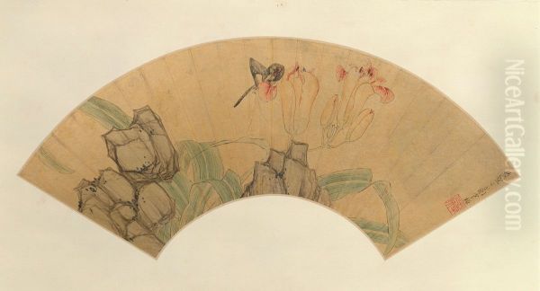 Chen Hongshou's Painting of Shihudie on a Fan Leaf is a captivating example of late Ming dynasty literati painting, embodying the artist's distinctive blend of lyrical elegance and subtle rebellion. The fan-shaped composition portrays shihudie (stone butterflies—a poetic motif of weathered rocks resembling butterflies) with meticulous brushwork, where fluid ink strokes contrast delicate mineral pigments. Chen's style merges the refined aesthetic of Southern School painting with his signature elongation of forms, reflecting both his classical training and idiosyncratic individualism. Historically significant as a bridge between traditional Chinese court painting and the emerging eccentricity of the early Qing period, this work exemplifies weirdness (guai)—a prized quality in scholar-artist circles for its departure from convention while maintaining technical mastery. The intimate scale and poetic subject matter suggest it was created for private contemplation among connoisseurs.