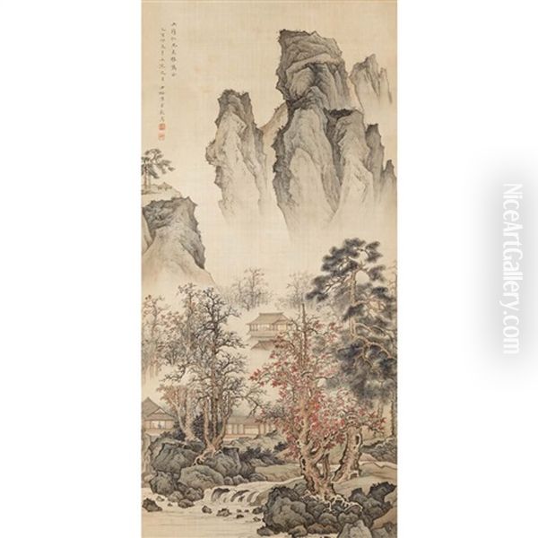 Chen Shaomei's Fall Landscape is a mesmerizing celebration of autumn's lyrical beauty, rendered with exquisite elegance that blends traditional Chinese ink techniques with subtle modern sensibilities. The painting unfolds a poetic scene of undulating mountains bathed in warm amber and gold hues, where delicate maple leaves flutter like crimson whispers against misty valleys. Chen Shaomei (1918–2000), a distinguished figure in 20th-century Chinese painting, masterfully merges the disciplined brushwork of the Lingnan School with a dreamlike, almost impressionistic treatment of light. This work exemplifies his unique ability to infuse classical shan-shui (山水) traditions with emotive spontaneity, bridging historical reverence and contemporary accessibility. Revered for revitalizing ink wash aesthetics during a period of rapid modernization, Fall Landscape occupies a pivotal place in the discourse of East Asian art—where heritage and innovation harmonize like the very seasons it depicts.