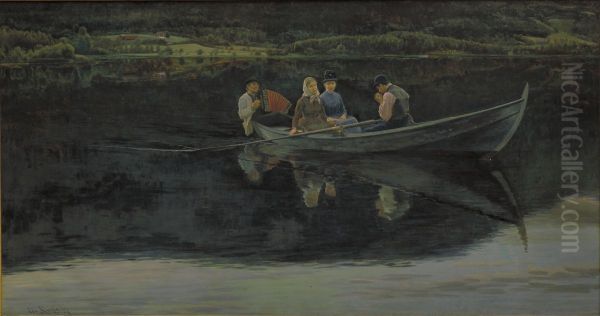 Christian Skredsvig's Midsummer's Eve in Norway (1892) is a captivating portrayal of Norway’s luminous summer nights, blending realism with a touch of Romanticism. The painting depicts a serene landscape bathed in the soft golden glow of the midnight sun, where tranquil waters mirror the sky and rolling hills stretch into the distance. Skredsvig, a key figure in Norwegian art, masterfully captures the ethereal quality of Nordic light and the quiet harmony between nature and human presence—often a solitary cottage or figures enjoying the timeless moment. As part of the national Romantic movement, his work reflects the 19th-century fascination with folklore and untouched landscapes, cementing his legacy as Norway’s answer to the French Barbizon School. The painting’s atmospheric depth and emotional resonance make it a celebrated example of Scandinavia’s contribution to European plein air painting.