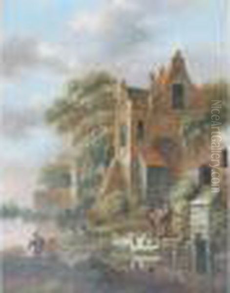 Personnages En Conversation Devant Un Cottage En Bord De Riviere