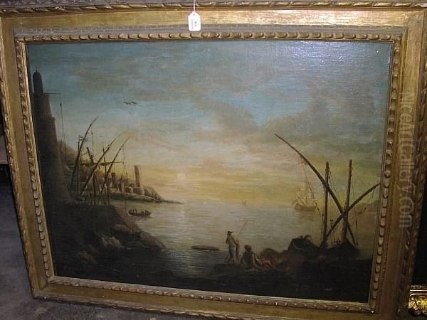 Harbour Scene With Figures By A Lighthouse In The Foreground
