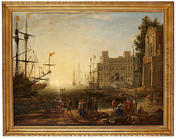 Claude Lorrain's Capriccio med en italiensk hamn i skymning med Villa Medici och handelsman (Capriccio with an Italian Port at Dusk Featuring Villa Medici and Merchants) epitomizes the 17th-century idealized landscape tradition. Bathed in golden twilight, the painting merges architectural fantasy with atmospheric realism—Villa Medici, transposed from Rome to a dreamlike harbor, anchors the scene while merchants and boats animate the foreground. Lorrain’s mastery lies in his luminous treatment of light; the sun’s fading glow reflects on water and stone, evoking tranquility and grandeur. As a leading figure of Baroque landscape painting, Lorrain influenced generations, including Turner and the English Picturesque movement. This capriccio (whimsical architectural fantasy) exemplifies his signature blend of poetic license and classical harmony, cementing his legacy as a pivotal bridge between Renaissance order and Romantic emotionality.