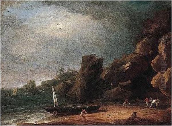 Claude-Joseph Vernet’s A Coastal Landscape With Fishermen (c. 1770s) is a quintessential example of 18th-century French Romantic landscape painting, capturing the sublime beauty of nature intertwined with human activity. The scene depicts fishermen along a rugged coastline, where turbulent waves crash against weathered rocks under a dramatic, cloud-filled sky. Vernet’s meticulous attention to atmospheric effects—the interplay of light and shadow, the subtle gradations of the horizon—creates a sense of both grandeur and intimacy. His works were highly sought after by European aristocracy, reflecting the Enlightenment-era fascination with nature’s power and pastoral serenity. As a leading figure of the vedute (detailed landscape) tradition, Vernet bridged the Rococo’s decorative charm and the emerging Romantic movement’s emotional intensity, solidifying his legacy as a master of maritime scenes.