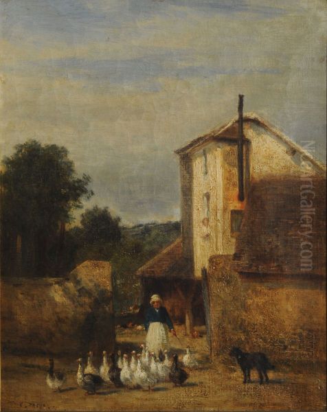 La gardeuse d'oies ("The Goose Girl") by Constant Troyon (1810–1865) captures the serene charm of rural life in mid-19th century France. Painted in Troyon’s signature Barbizon style, the artwork depicts a young shepherdess tending her flock of geese amidst a lush, atmospheric landscape. Troyon’s loose brushwork and muted earth tones—soft greens, browns, and grays—evoke a sense of pastoral tranquility, while his masterful treatment of light reflects the Barbizon School’s focus on naturalism and plein air techniques. Though best known for animalier paintings (particularly cattle scenes), Troyon’s La gardeuse d'oies exemplifies his skill in blending rustic subject matter with poetic realism. The painting holds significance in art history as a bridge between Romanticism and Impressionism, showcasing the Barbizon movement’s influence on later landscape artists like Monet. Its quiet dignity and harmonious composition resonate with viewers, offering a timeless glimpse into agrarian simplicity.