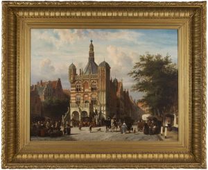 Townsfolk Gathered Around Market Stalls, A Capriccio View Ofwoerden's Cityhall In The Background