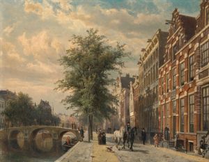 The painting Het Doopsgezinde Weeshuis De Oranjeappel aan de Herengracht 344 by Cornelis Springer (1817–1891) is a masterful representation of 19th-century Dutch architectural realism. Known for his meticulous attention to detail, Springer captures the imposing yet serene facade of this Amsterdam orphanage with precision, framed by soft, diffused light that evokes a sense of quiet dignity. The artwork reflects Springer's signature style—combining topographical accuracy with atmospheric depth—and situates him among the leading Dutch Romantic painters. This piece not only documents a historic charitable institution but also exemplifies the 19th-century fascination with urban heritage.