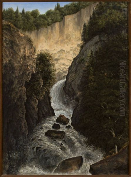 The Mountain Waterwall in St. Gervais by Cyprian Lachnicki is a mesmerizing ode to nature’s grandeur and the sublime power of alpine landscapes. Lachnicki, a Polish painter active in the late 19th century, masterfully blends Romanticism’s emotional intensity with meticulous realism, capturing the torrential rush of water cascading down rugged cliffs amidst mist-shrouded peaks. The painting’s dramatic play of light and shadow—cool blues and silvers contrasting with earthy browns—evokes both serenity and dynamism, drawing viewers into the raw, untamed beauty of the French Alps. As part of the broader European tradition of landscape painting, Lachnicki’s work bridges the poetic idealism of Caspar David Friedrich and the precision of the Barbizon School, offering a unique glimpse into the era’s fascination with nature’s spiritual and aesthetic dimensions. Though less widely known than contemporaries like Turner or Bierstadt, Mountain Waterwall remains a testament to Lachnicki’s skill in elevating landscapes into emotive, almost theatrical experiences.