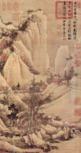 Dai Jin's Grand View of Mountains and Rivers epitomizes the majesty of Ming Dynasty court painting, where towering peaks pierce swirling mists and ink-washed valleys stretch into infinity. As the foremost master of the Zhe School, Dai Jin revitalized the Song Dynasty monumental landscape tradition with dynamic brushwork – his jagged cliffs rendered in ax-cut皴法 (cunfa) technique seem to quiver with restrained energy, while delicate washes of indigo and malachite whisper of dawn light filtering through the clouds. This scroll represents a pivotal moment when professional painters like Dai Jin bridged the gap between scholarly ink play and imperial visual grandeur, its composition balancing lavish detail with profound emptiness characteristic of Daoist cosmology. The rhythmic alternation between densely textured rock faces and ethereal void spaces creates a visual meditation on yin-yang principles, securing its status as a canonical work that influenced subsequent court artists for centuries.