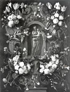 A Stone Cartouche Surrounded By Garlands Of Roses, Tulips, Narcissi And Other Flowers And Butterflies With The Madonna And Child (collab W/cornelis Schut)