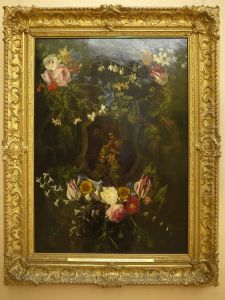 Bloemen op een relief met een nis, waarin een borstbeeld van Flora