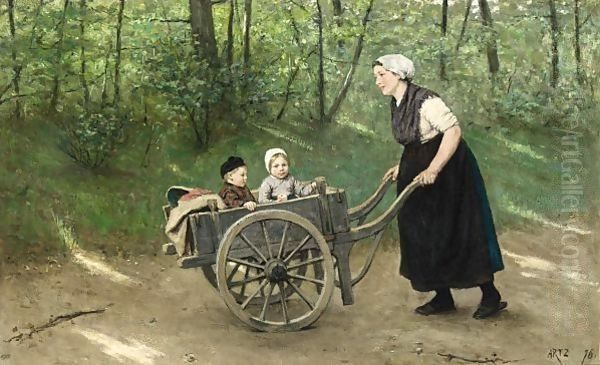 David Adolf Constant Artz's "A Stroll In The Pushcart" captures a charming slice of 19th-century Dutch life with exquisite realism and warmth. Painted in 1873 during the height of the Hague School movement, the work exemplifies Artz's mastery in genre scenes, portraying two children joyfully riding a pushcart through a sun-dappled countryside path. The artist's delicate brushwork renders the interplay of light and shadow on their clothing and the rustic surroundings, while his muted yet harmonious palette – dominated by earthy browns, soft greens and creamy whites – evokes nostalgic tranquility. As a leading figure bridging Romanticism and Realism, Artz gained renown for such idealized yet authentic depictions of peasant life, making this painting historically significant as both a technical showcase of Dutch realism and a cultural document of bourgeois sentimentalism in post-industrial Europe.