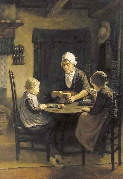 David Adolf Constant Artz’s Midday Meal captures a serene domestic moment suffused with warmth and quiet intimacy. Painted in 1876 during the height of Dutch Realism, the work reflects Artz’s mastery of light and texture, portraying a young girl savoring a simple meal by a sunlit window. The soft glow filtering through the curtains bathes the scene in gentle radiance, emphasizing the artist’s meticulous attention to detail—from the folds of the girl’s apron to the rustic tableware. Artz, a student of Jozef Israëls, was deeply influenced by the Hague School, which championed naturalism and subdued palettes. Midday Meal exemplifies this tradition, offering a tender glimpse into everyday life while avoiding sentimentalism. Though less internationally renowned than his peers, Artz’s works are celebrated for their authenticity and technical finesse, securing his place as a subtle yet significant figure in 19th-century European genre painting.