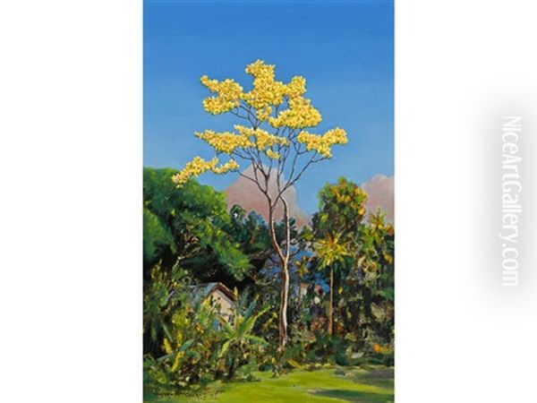 David Howard Hitchcock’s The Gold Tree is a mesmerizing ode to Hawaii’s natural beauty, capturing the luminous glow of sunlight filtering through the leaves of a gilded tree. Painted in the late 19th or early 20th century, this work reflects Hitchcock’s unique blend of Impressionism and traditional Hawaiian artistic sensibilities, showcasing his mastery of light and texture. As one of Hawaii’s foremost artists, Hitchcock played a pivotal role in shaping the islands’ art scene, blending Western techniques with indigenous themes. The Gold Tree stands as a testament to his ability to evoke both tranquility and awe, making it a significant piece in the canon of Pacific Rim art. Its ethereal quality and delicate interplay of light and shadow place it among the finest examples of tropical Impressionism, offering viewers a glimpse into Hawaii’s sublime landscapes.