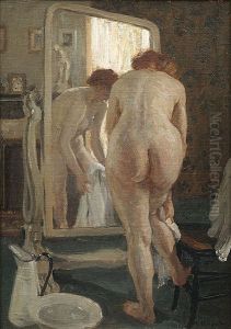 E. Phillips Fox’s After the Bath (1912) is a luminous Impressionist masterpiece that captures an intimate moment of quiet repose. The painting depicts a young woman draped in a delicate white robe, her skin glowing against soft, diffused light—likely inspired by Fox’s time studying plein-air techniques in France. The loose brushstrokes and vibrant interplay of light and shadow reflect his mastery of tonal Impressionism, a style bridging European influences with Australian artistic sensibilities. Fox’s work is celebrated for elevating everyday domestic scenes into poetic studies of light and femininity, earning him a key place in Australia’s Heidelberg School. After the Bath exemplifies his ability to infuse tranquil moments with warmth and vitality, making it a timeless piece in the canon of early 20th-century art.