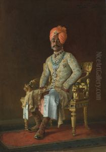 The vivid A Pair of Portraits of Indian Princes by E.A. Harris captivates with its rich, exotic allure, blending 19th-century British colonial portraiture with subtle Indian aesthetic sensibilities. Harris, likely active during the British Raj, masterfully renders the princes in ornate turbans and embroidered robes, their gazes both regal and enigmatic. The warm, earthy tones of the backgrounds—often ochre or deep green—contrast with the intricate gold detailing on their attire, evoking a sense of opulence and cross-cultural exchange. Though less documented than works by court painters like Raja Ravi Varma, Harris’s portraits occupy a intriguing niche in colonial-era art, reflecting both European academic techniques and an emerging fascination with Indian nobility. Their historical significance lies in capturing a transitional moment where Western artists sought to document—and sometimes romanticize—Eastern subjects.