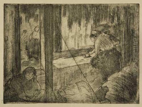 Edgar Degas' Blanchisseuses (Laundresses) captures the quiet poetry of everyday labor in late 19th-century Paris. The painting, created circa 1884–1886, belongs to Degas' celebrated series depicting working-class women—a thematic departure from the era's conventional bourgeois subjects. Rendered in his distinctive Impressionist style with loose, dynamic brushstrokes, the composition focuses on laundresses mid-task, their postures exuding both fatigue and rhythmic grace. Warm ochres and muted blues dominate the palette, evoking the steamy atmosphere of the laundry room. Art historically, Blanchisseuses reflects Degas' fascination with movement and modern life, bridging Realism's social observation and Impressionism's fleeting-light effects. Its unidealized portrayal of labor resonated with Zola's naturalism, cementing Degas' role as a radical chronicler of urban existence beyond the glamour of ballet or café scenes.