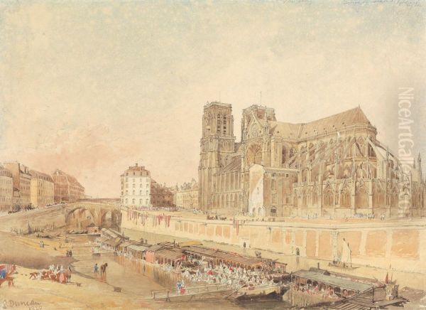 Edward Duncan’s Notre Dame, Paris, from the Left Bank captures the timeless charm of 19th-century Paris with a delicate balance of intimacy and grandeur. The painting offers a serene riverside view of Notre-Dame Cathedral from the Left Bank, where the play of light on water and the architectural details of the Gothic masterpiece create a dreamy, atmospheric quality. Duncan, a British watercolorist known for his topographical precision and romantic sensibility, rendered this scene with soft washes of color and fine brushwork—hallmarks of Victorian-era landscape painting. Though less renowned than his French contemporaries like Corot, his works provide valuable documentation of Europe’s urban and rural landscapes during a period of rapid modernization. This piece stands as a quiet yet significant example of how British artists interpreted Continental scenes, bridging realism and idealism.