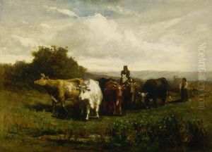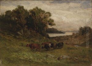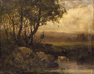 Untitled (forest scene with bridge, cows in stream in foreground)