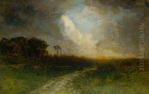 Untitled (landscape, boat moored near stream, man walking in foreground)