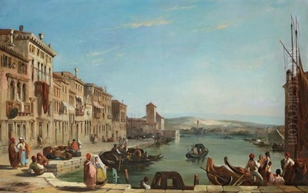 Edward Pritchett’s Vue D’un Quai A Venise (View of a Quay in Venice) captures the romantic charm of 19th-century Venetian life with an atmospheric, almost dreamlike quality. The painting, executed in the mid-1800s, reflects Pritchett’s mastery of the picturesque style, blending precise architectural detailing with soft, luminous brushwork to evoke the play of light on water and weathered stone. As one of the few British artists specializing in Venetian scenes during this period, Pritchett’s work offers a bridge between the topographical tradition and the more emotive Romantic approach, making it a valuable piece for understanding the evolution of European landscape painting. The composition—featuring gondolas, bustling quaysides, and the delicate interplay of shadows—invites viewers into the quiet poetry of everyday Venice, positioning it as both a historical document and an artistic gem.