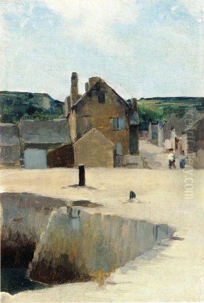 Eero Järnefelt's Kyläkuva Bretagnesta (Village Scene from Brittany) captures the raw beauty of rural Brittany with remarkable sensitivity. Painted in 1883 during the artist's formative years in France, this oil work exemplifies the transition from romantic nationalism to plein-air realism that defined Nordic artists' engagement with French naturalism. The composition bathes Breton cottages in delicate northern light, their thatched roofs and stone walls rendered with precise yet poetic brushwork that recalls Bastien-Lepage's influence. Järnefelt's masterful treatment of reflected sunlight on whitewashed walls creates a luminous atmosphere, while peasant figures going about daily chores anchor the scene with quiet dignity. As one of the first Finnish artists to bring French naturalist techniques to Nordic painting, this work holds particular significance in Scandinavian art history, bridging the gap between idealized national landscapes and modern observational painting. The restrained palette of ochres, slate blues and chalky whites demonstrates Järnefelt's sophisticated color discipline, making this a pivotal work in his oeuvre before his later turn towards symbolism.