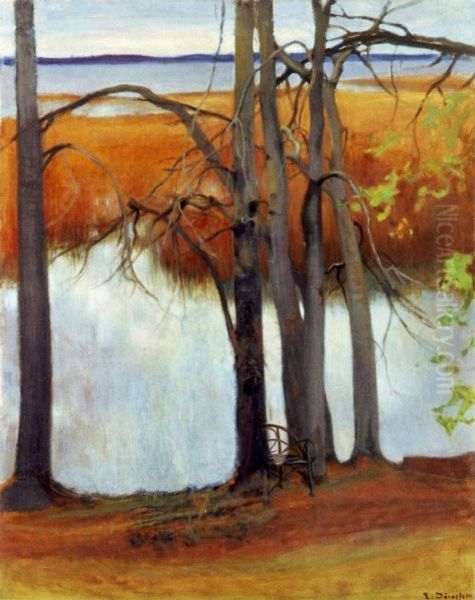 In Eero Järnefelt’s Lake Shore with Reeds, the tranquil beauty of a Finnish lakeside unfolds with poetic subtlety. Painted in 1899 during the artist’s realist period, the work captures a misty morning where slender reeds sway gently against a mirror-like lake, their reflections blending seamlessly into the water’s muted tones. Järnefelt, a key figure in Finland’s national romantic movement, masterfully balances delicate brushwork with a muted color palette of silvery blues, soft greens, and earthy browns, evoking a sense of serene solitude. The painting’s atmospheric quality aligns with the era’s fascination with nature’s spiritual and emotional resonance, bridging realism and symbolism. It holds a notable place in Nordic art history as a testament to Järnefelt’s ability to elevate humble landscapes into profound meditations on harmony and quietude.