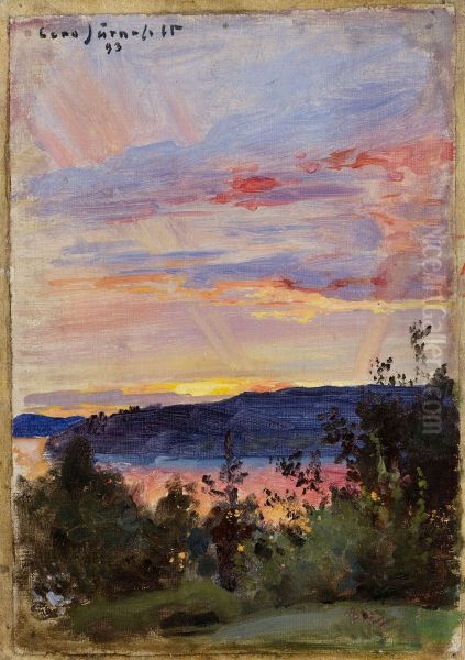Solnedgang (Sunset) by Eero Järnefelt is a mesmerizing Finnish masterpiece that captures the serene yet dramatic beauty of nature bathed in golden twilight. Painted in 1892 during Finland's National Romantic period, Järnefelt's work embodies the era's reverence for Nordic landscapes and national identity. The painting's luminous sky, reflected in a tranquil lake, creates a poetic interplay of light and shadow—showcasing his mastery of realism infused with Symbolist undertones. As a pivotal figure bridging traditional academic art and emerging modernism, Järnefelt influenced Finland's artistic awakening alongside figures like Gallen-Kallela. Solnedgang remains iconic for its emotional depth and technical precision, epitomizing the ethereal Nordic light that later inspired Expressionists.