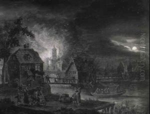 A Moonlit River Landscape With A Village Fire
