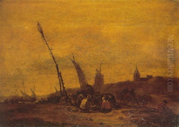 Egbert van der Poel's Fisherfolk Bartering Over Their Catch On The Beach captures a lively slice of 17th-century Dutch coastal life. The painting bursts with movement—fishermen haggle over their haul, their weathered faces and sturdy postures reflecting the toil of their trade, while the backdrop of a windswept beach and a brooding sky lends drama. Van der Poel, a master of genre painting, excels in rendering textures—glistening fish scales, coarse nets, and billowing fabrics—all bathed in the soft, diffuse light typical of Dutch Golden Age realism. As a follower of the tonalist tradition, he imbues the scene with earthy browns and muted grays, punctuated by the vivid accents of the catch. Though less famed than Vermeer or Rembrandt, van der Poel’s works are treasured for their ethnographic precision and knack for storytelling, making this piece a valuable window into maritime economies of the era.