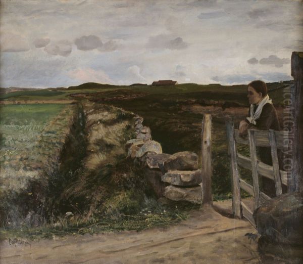 Eilif Peterssen’s Jaerbilde med pike ved grinden ("Summer Picture with Girl by the Gate") is a captivating example of Norwegian Romantic painting, blending lyrical naturalism with a touch of symbolic atmosphere. Created in 1884, the work depicts a young girl standing by a rustic gate, bathed in the soft, golden light of a summer day. The lush greenery and dappled sunlight evoke a sense of tranquil nostalgia, characteristic of Peterssen’s sensitive portrayal of rural life. As a leading figure in Scandinavia’s plein air movement, Peterssen infused his compositions with poetic realism, influenced by French Impressionism yet rooted in Nordic traditions. The painting holds significance in art history as a bridge between 19th-century Romanticism and the emergence of modernism in Northern Europe, showcasing the artist’s mastery of light and emotional depth.