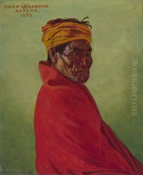 The poignant portrait Geronimo by Elbridge Ayer Burbank captures the legendary Apache leader in a moment of quiet intensity. Rendered with meticulous detail and lifelike precision, Burbank's realism conveys both the dignified resilience and the weathered wisdom etched into Geronimo’s face. Painted in the late 19th century during his time as a prisoner of war, the artwork transcends a mere likeness—it immortalizes a symbol of Indigenous resistance amid America’s westward expansion. Burbank’s style bridges ethnographic documentation and portraiture, reflecting the era's fascination with Native American subjects while avoiding romanticization. The painting holds a significant place in art history as one of the most recognized depictions of Geronimo, offering a rare humanizing gaze into a figure often mythologized. Its subdued palette and intimate composition invite viewers to confront the weight of history.