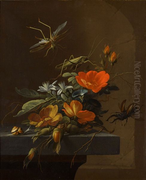 Still life of Austrian briars and other flowers on a stone plinth, with a flying stag beetle and other insects