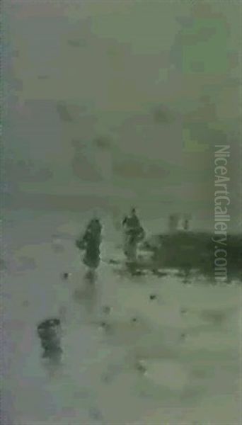 Eliseo Meifrèn y Roig’s Playa Con Personajes (Beach with Figures) is a luminous example of late 19th-century Catalan Impressionism, capturing the ephemeral beauty of Mediterranean light and leisure. The painting depicts a vibrant coastal scene, where bathers stroll along sun-dappled sands and azure waves gently lap the shore. Meifrèn’s loose, expressive brushwork and vivid color palette—ranging from delicate pastels to deep marine blues—imbue the work with spontaneity and vitality, echoing the influence of French Impressionism while retaining a distinct Iberian sensibility. As a leading figure in Spain’s Luminista movement, Meifrèn played a pivotal role in modernizing Spanish landscape painting, bridging academic tradition and avant-garde experimentation. Today, Playa Con Personajes remains celebrated for its lyrical portrayal of nature’s transience and human connection to the sea, securing its place among the most evocative works of Catalan coastal art.